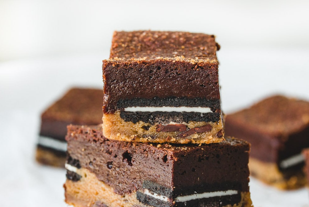Slutty Brownies are a layered dessert, featuring a base of chocolate chip cookie dough, a middle layer of Oreos, and topped with brownie batter. They are known for being outrageously indulgent and delicious.